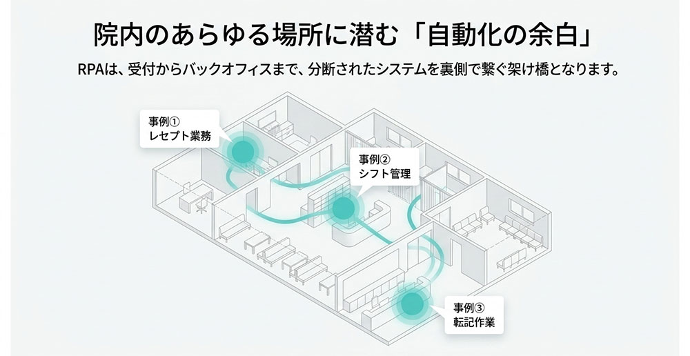 この記事では、「医療RPAってそもそも何?」という基本から、レセプト処理・シフト管理・問診票入力など具体的な活用事例、そして導入を成功させるためのポイントまでを、できるだけわかりやすくお伝えします。