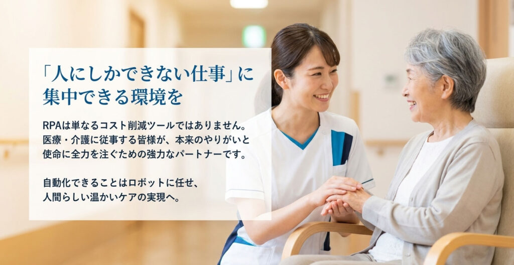 医療RPAは、スタッフを事務作業の疲弊から救い出し、質の高い医療・ケアを提供し続けるための強力なサポーターです。