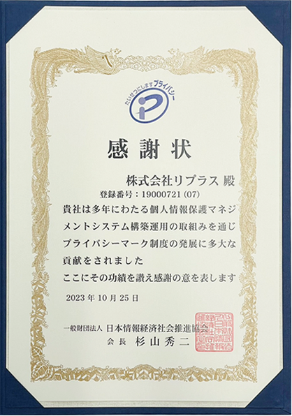 長年にわたり、個人情報保護に尽力し、プライバシーマーク制度に深い理解をしていることが認められこの度、感謝状を授与いただきました