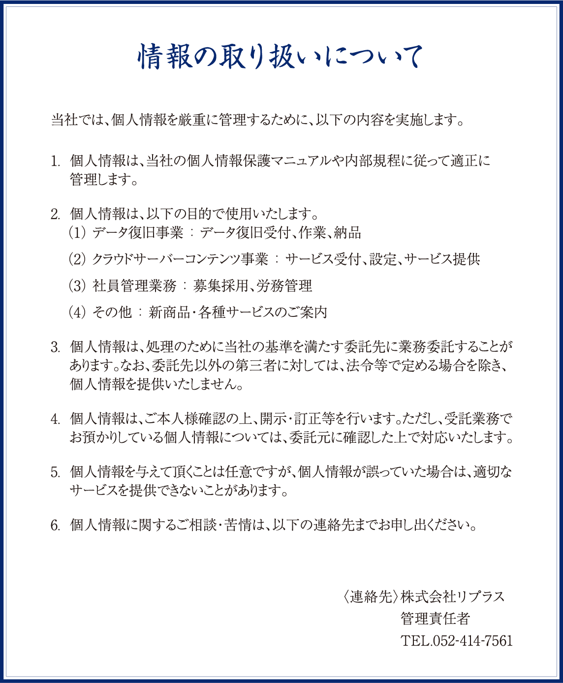 お客様の大切な大切なデータを機密情報と捉え、安心してデータ復旧をお任せいただけるようにいたします